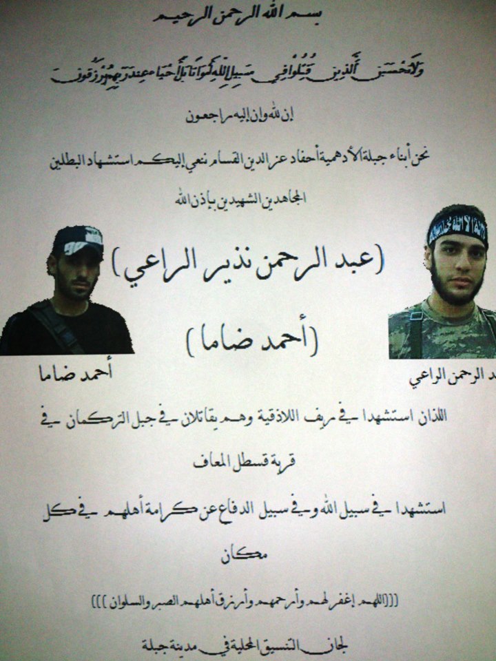 الشهيد أحمد ضاما أبو قصي تقبله الله ..عرفته في مدينة جبلة منذ كنا أطفالا حيث كنا نعيش في نفس الحارة وندرس في نفس المدرسة ...تظاهرنا سويا في ساحة الحرية ضد القتل والاجرام ...سجنا سويا في السجن المدني في اللاذقية بسبب معارضتنا وتظاهرنا ضد نظام الأسد ...خرجت من السجن قبله لأعود لممارسة عملي كمحامي ويكون لي شرف الدفاع عنه في قضاء فاسد ...مرت الايام والشهور لنلتقلي مرة أخرى في بلدة سلمى لنكون رفاق جه اد وسلاح ..لننتقل سويا بعد فترة الى جبل التركمان ليصبح أحمد أبو قصي قائدا لسرية الشهيد حسن كردي التي كنت أحد عناصرها ...كان أحمد شابا هادئ ..قياديا حكيما ..صبورا...متواضعا ..شارك بعدة معارك مع كتيبة الشهيد عز الدين القسام ..اصيب بمعركة صويلحة برصاصتين في كتفه ..ورغم ذلك لم يثنيه ذلك عن مواصلة المسيرة ..ليأتي اليوم الذي كان ينتظره ..والأمنية التي يطلبها ..الا وهي الشهادة .